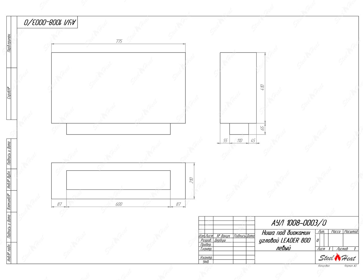 Встраиваемый Биокамин угловой SteelHeat Leader 800 левый предназначен для встраивания в глухие ниши из гипсокартона, кирпича, пеноблоков, бетона.